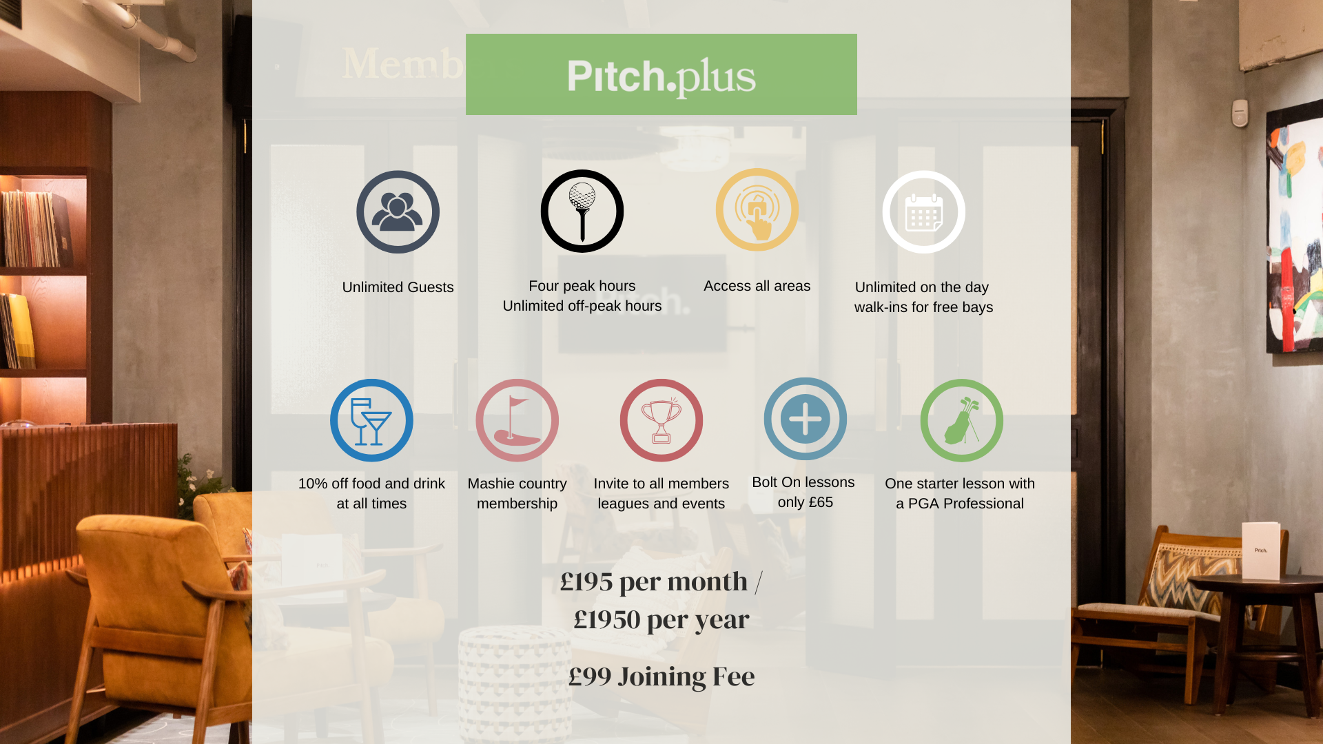 Pitch Plus is the ultimate membership for social golfers! Enjoy unlimited off-peak access and four peak hours per month at Pitch. Play, practice, and socialise with unlimited guests, whether you’re in a bay or relaxing in our stylish members’ lounge. It’s the perfect way to unwind with mates after work or play 9 holes with your favourite fourball!